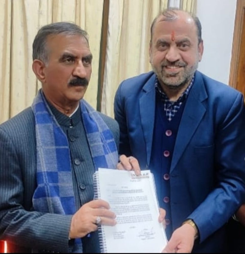 कैप्सन :- मुख्यमन्त्री जी की सेवा में प्रोजेक्ट रिपोर्ट सौंपते हुए इन्साफ संस्था के अध्यक्ष एवं पालमपुर के पूर्व विधायक प्रवीन कुमार ।